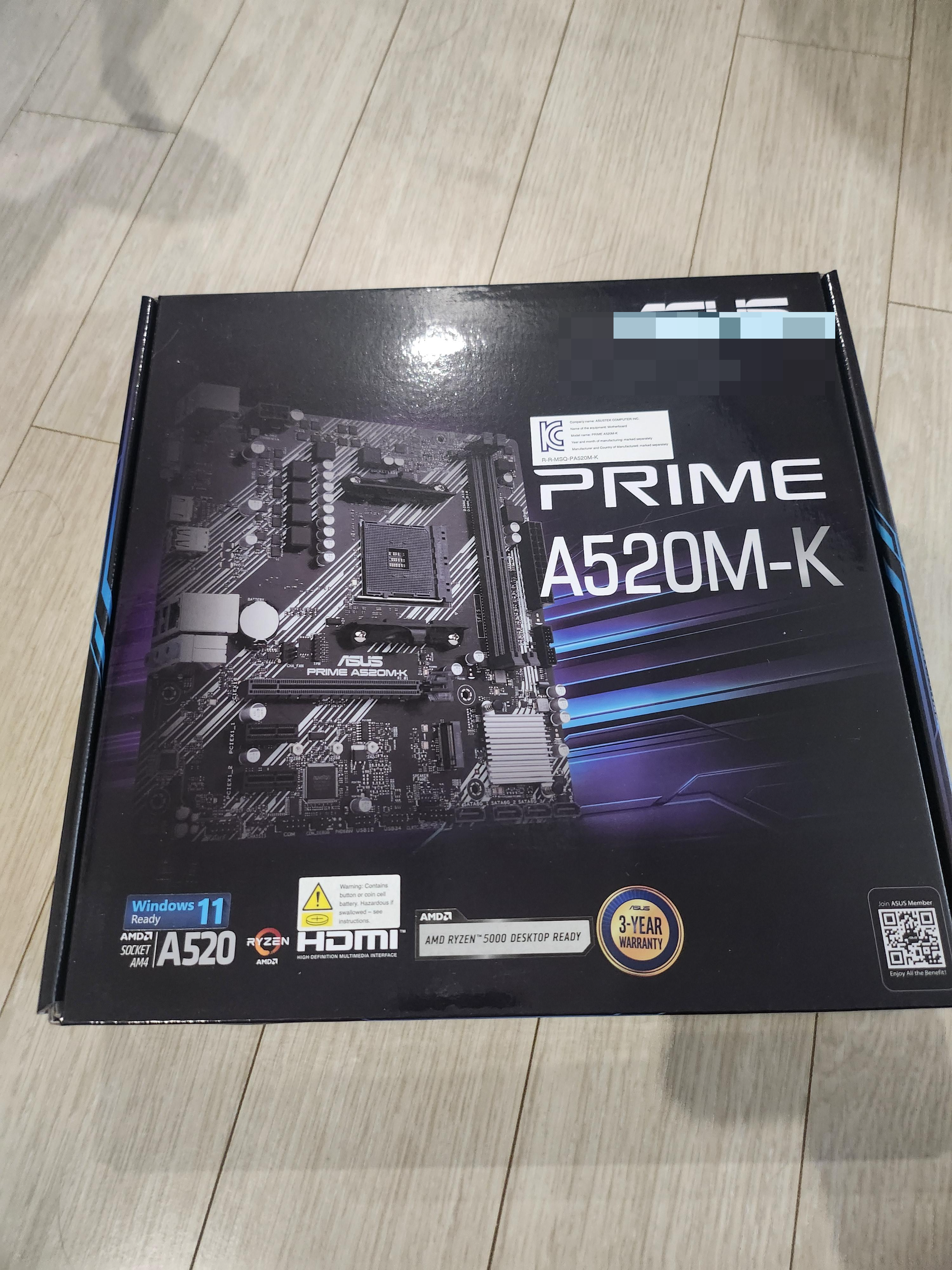 A520M-K는 화려한 LED 뽕(?)은 없지만, 블랙 기판에 화이트 라인으로 PRIME 로고가 박혀 있어서 꽤 시크하고 모던한 느낌이에요. M-ATX 사이즈라 생각보다 아담해서 미니 타워 케이스에도 쏙 들어갈 것 같더라고요. 들어봤을 때 무게감도 적당히 탄탄해서 "오, 생각보다 안 싼티 나는데?" 싶었어요.
