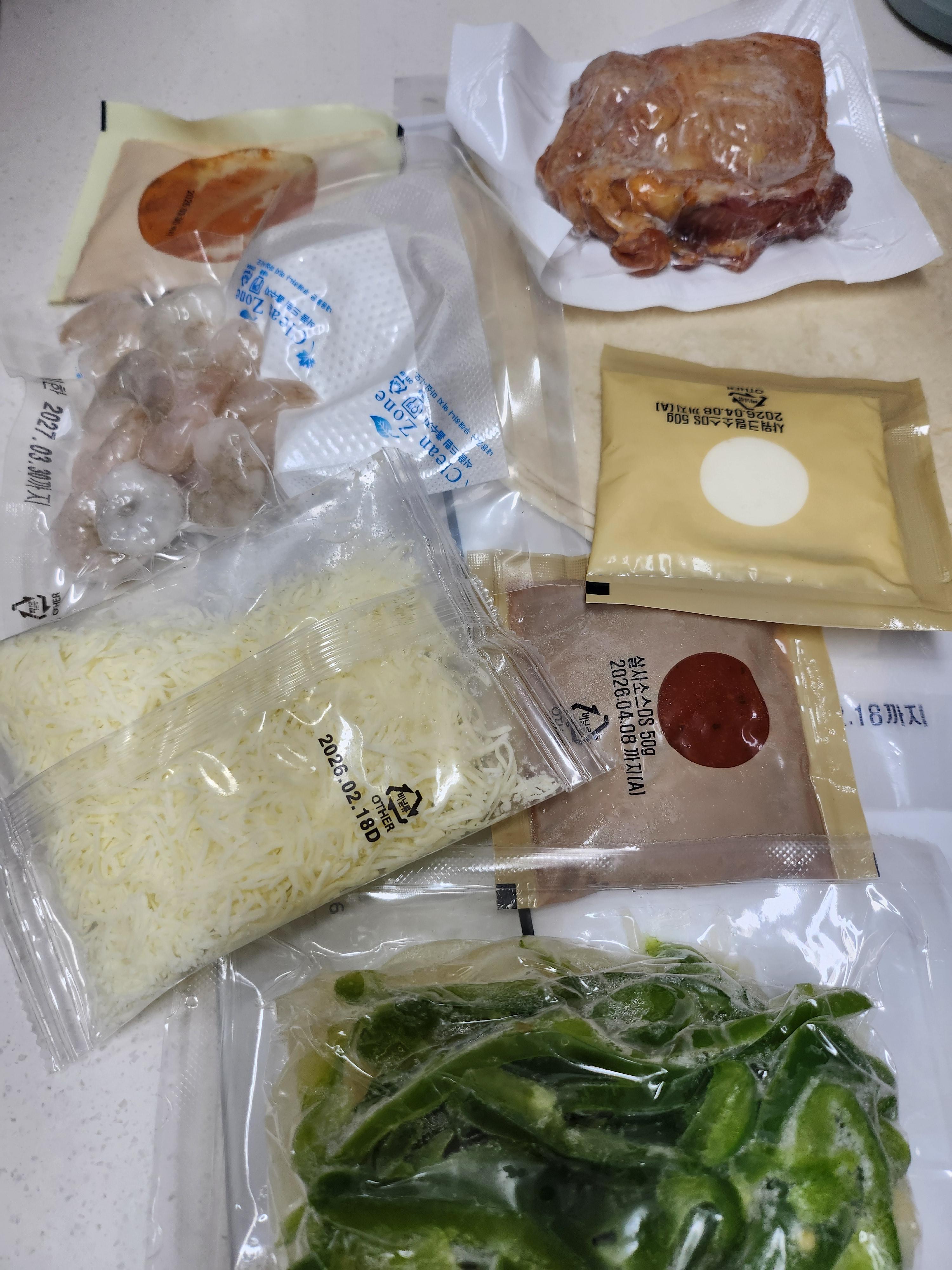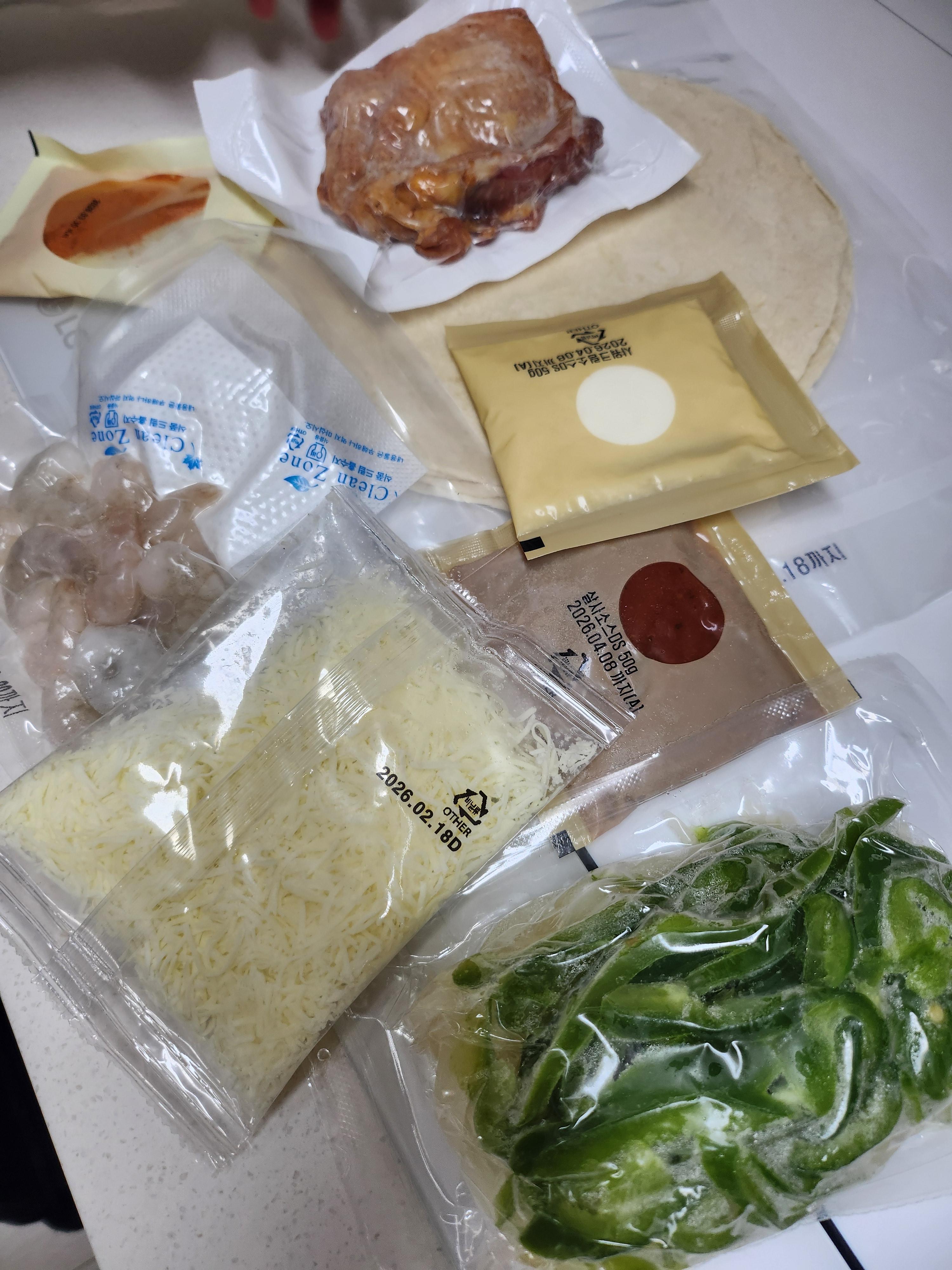 구성품: 양념 된 닭다리살, 통통한 새우, 파프리카&양파 믹스, 또띠아(6장), 그리고 소스 2종(칠리, 사워크림)까지!
