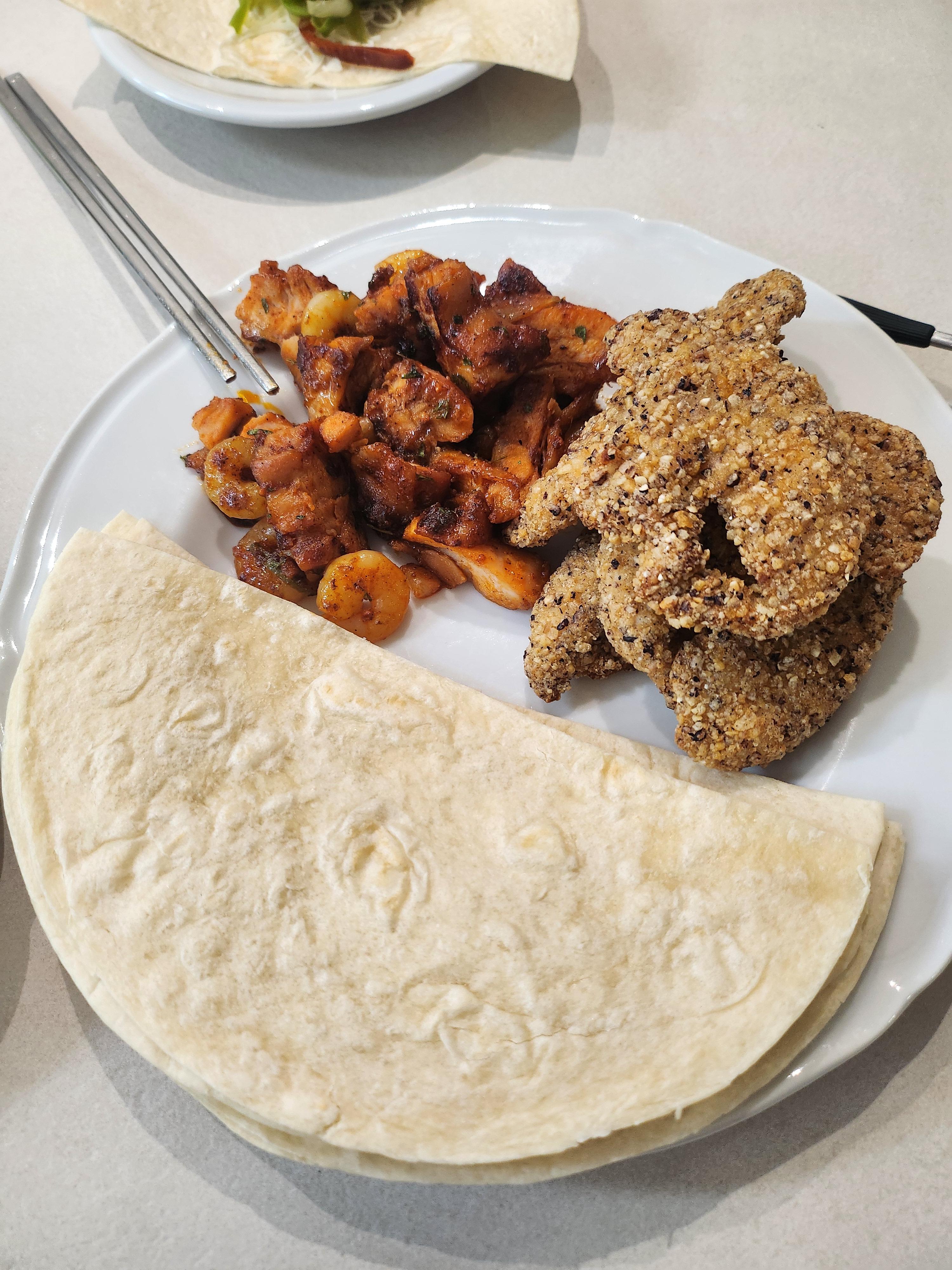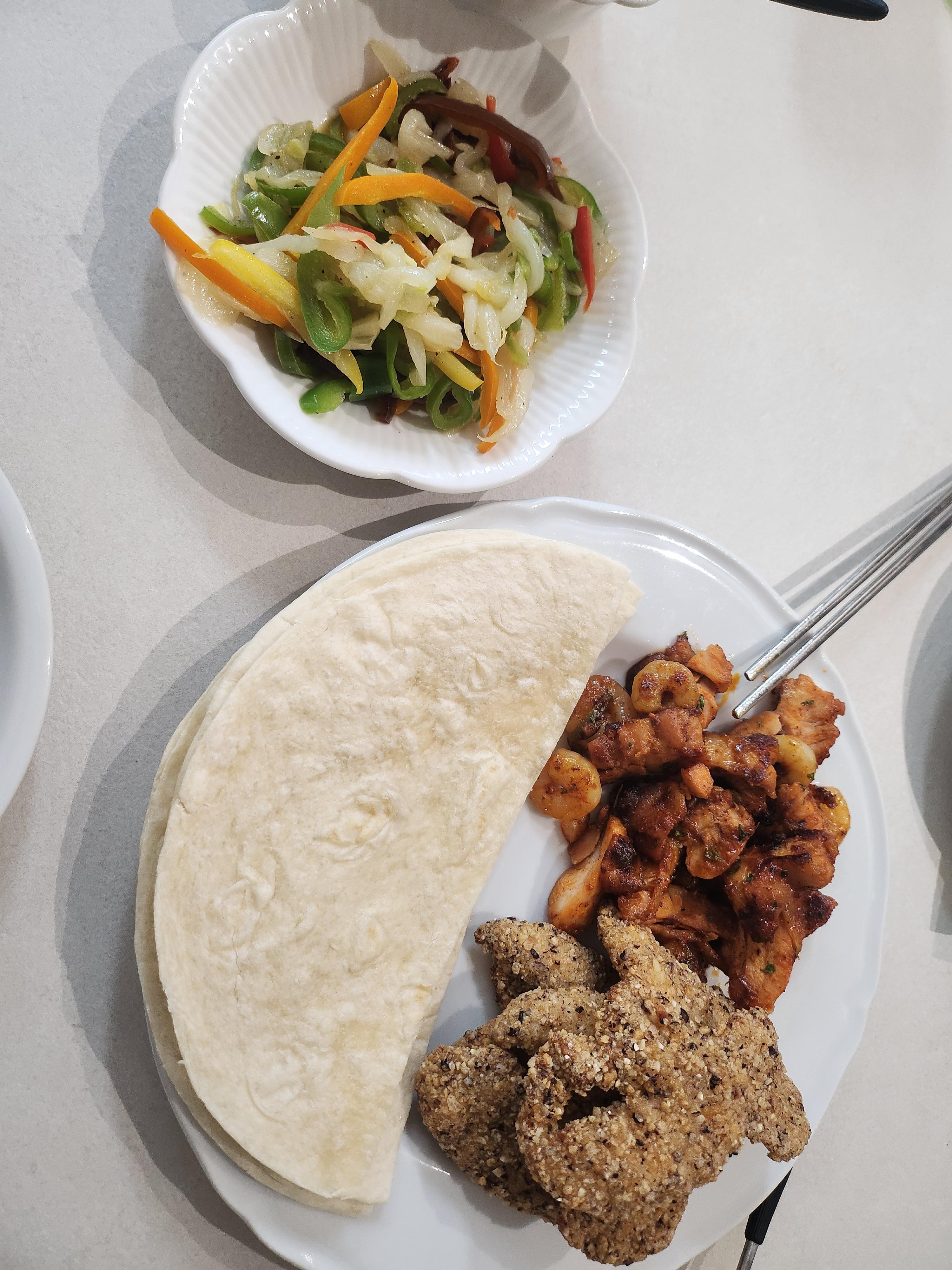 또띠아에 고기, 새우, 구운 야채 올리고 소스 듬뿍 찍어 한 입 싸 먹으니 "와, 이거 집들이 때 내놓으면 내가 한 줄 알겠는데?" 싶더라고요. ㅋㅋ
