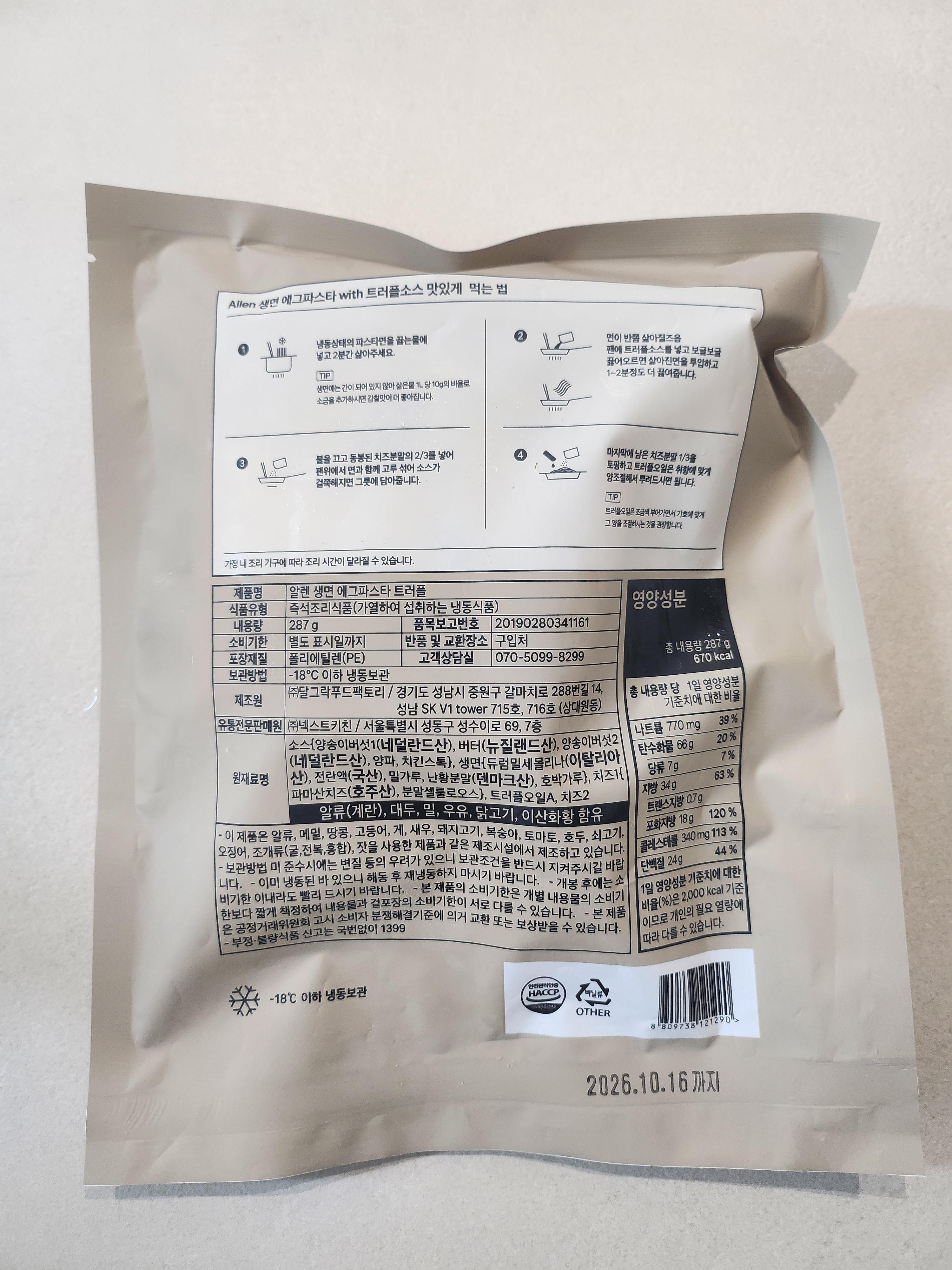 택배를 받고 포장을 딱 뜯었을 때 가장 먼저 든 생각은 '패키징이 정말 깔끔하다'였어요. 투명한 진공 포장 사이로 노란빛이 도는 에그파스타 면발과 콕콕 박혀있는 트러플 조각들이 눈에 확 들어오더라구요. 💡